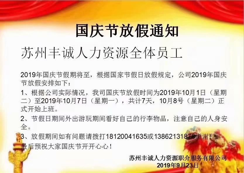 蘇州豐誠人力國慶放假通知!